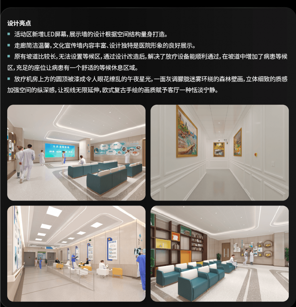 改造内容:活动区,候诊区,放疗机房,走廊,展示墙,LED屏幕,导视标识,文化墙整体规划